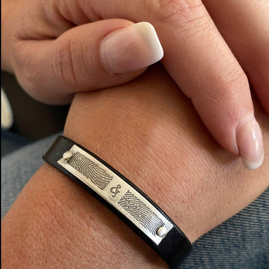 Leather Wide Band Bracelet w/ Sterling Silver Plate, Two Fingerprints