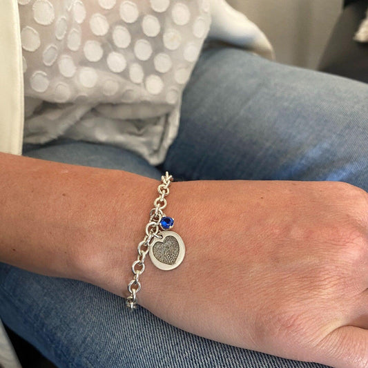 Classic Sterling Silver Charm Bracelet w/ Fingerprint & Birthstone CZ