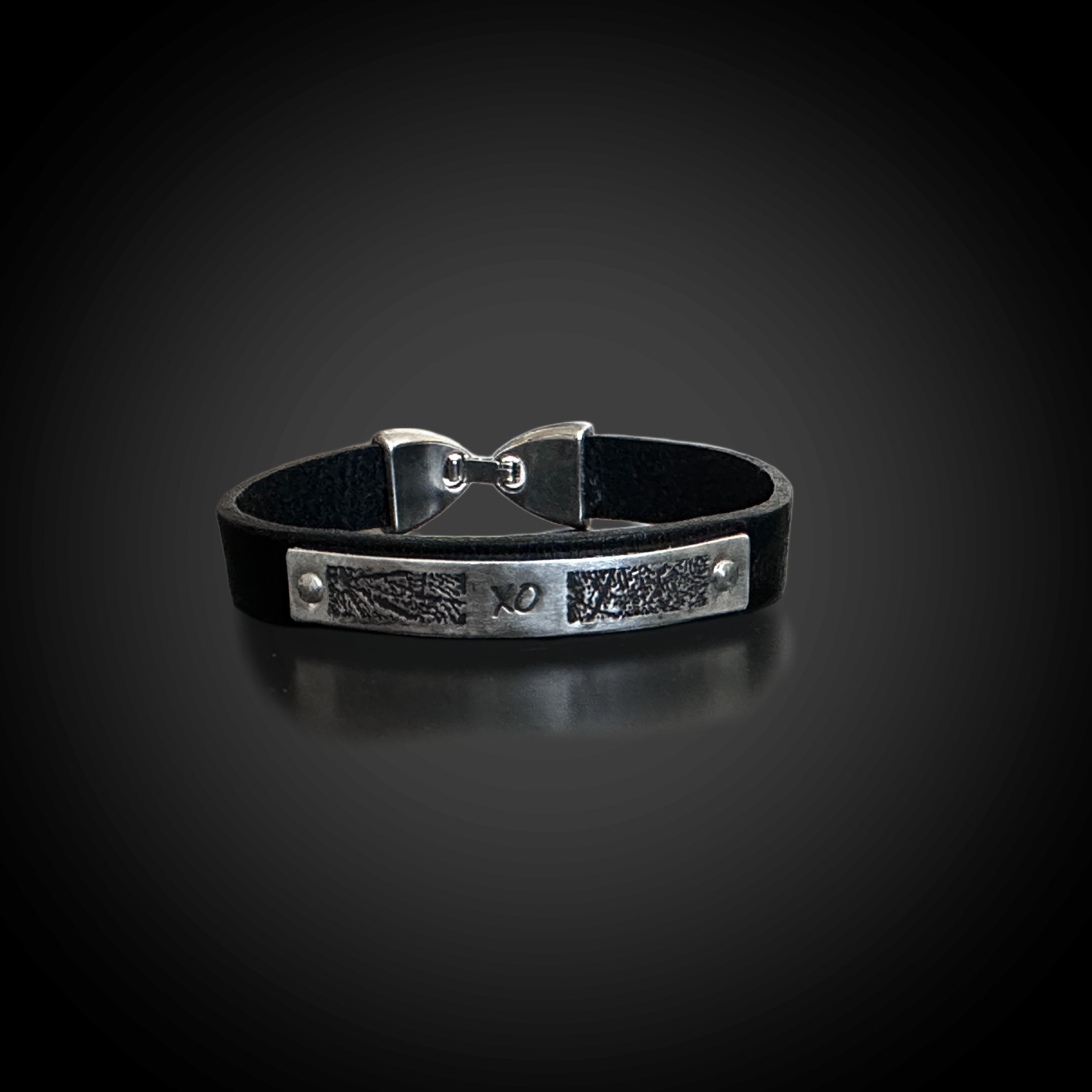This bracelet is made with top quality genuine cowhide flat black 10mm (approx 3/8") leather. The Flat Snap clasp features a secure closure that makes it easy to get on/off. The bracelet features a sterling silver plate (approx. 1.5" x .25")