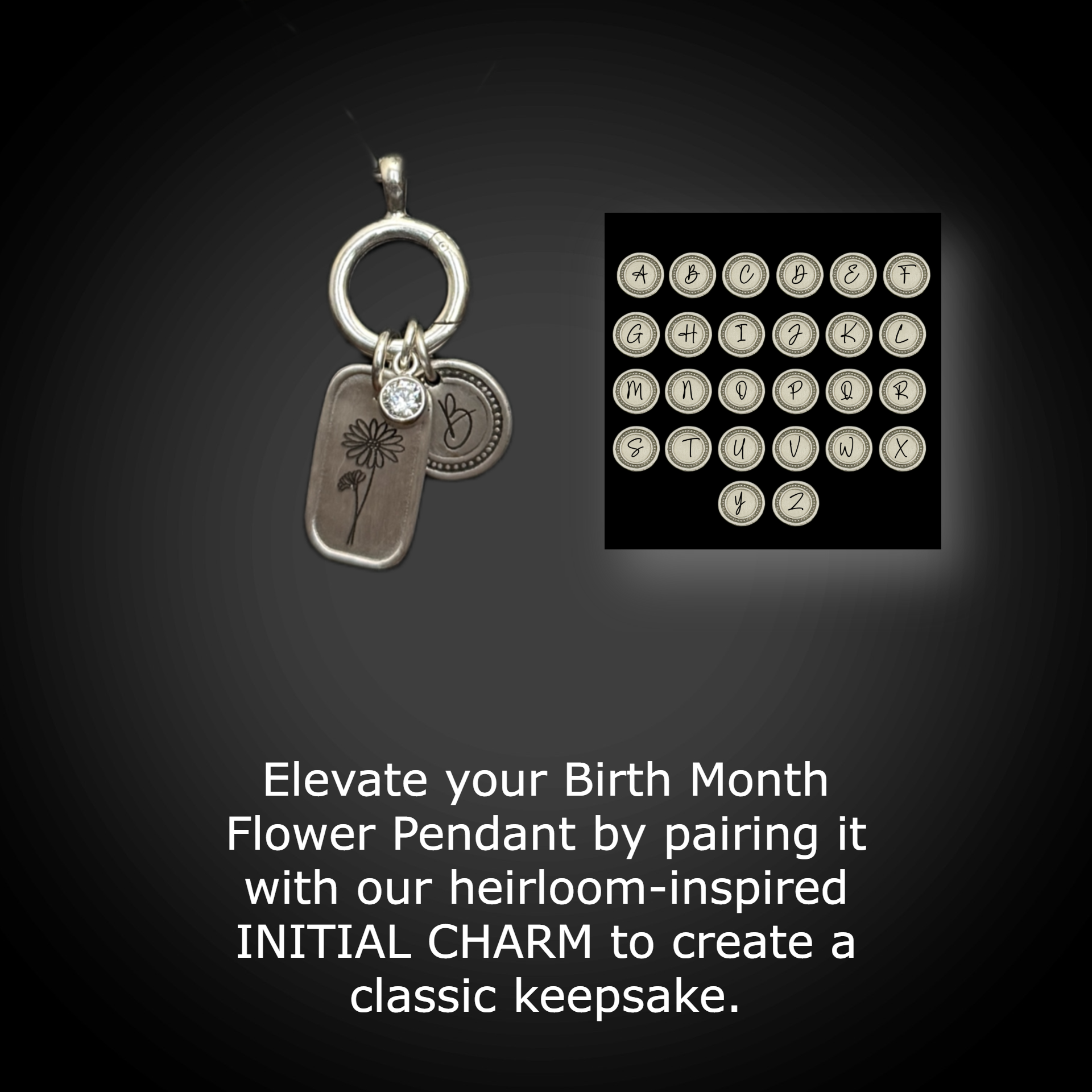 - An elegant, single line illustration of your Daisy birth month flower engraved on a sterling silver charm, measuring approximately 3/4" x 1/2". (Overall size is 1 1/2" x 1/2")