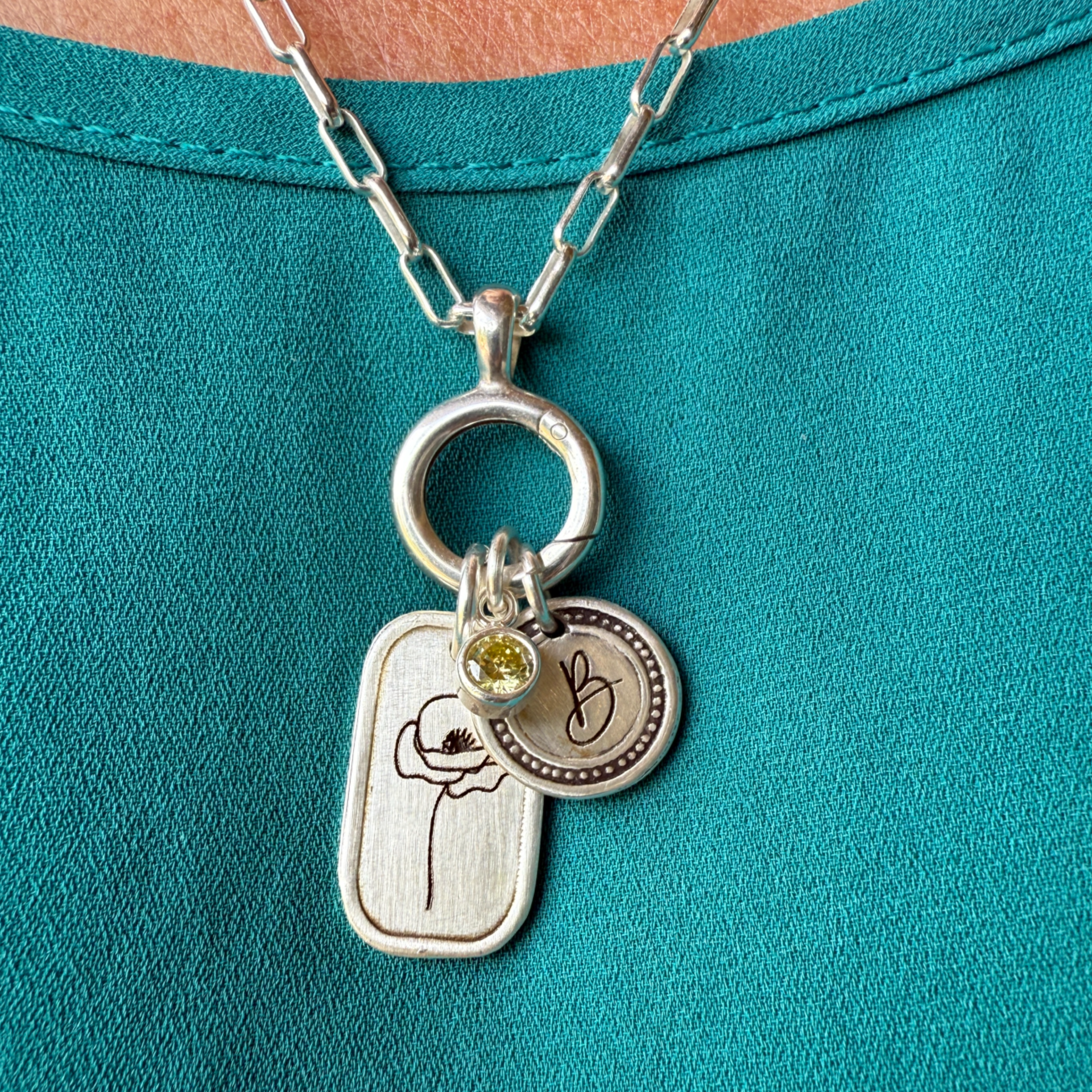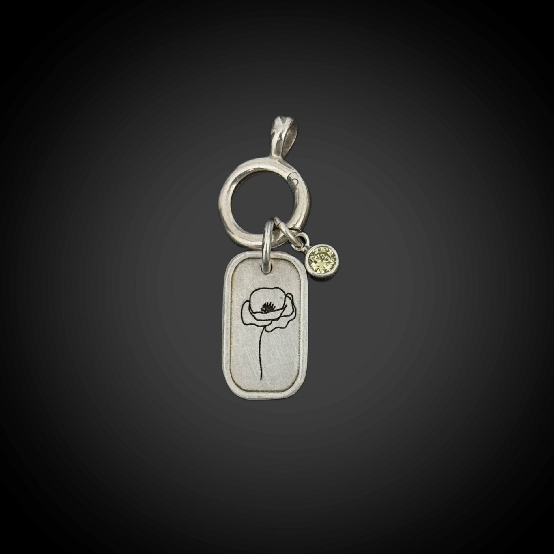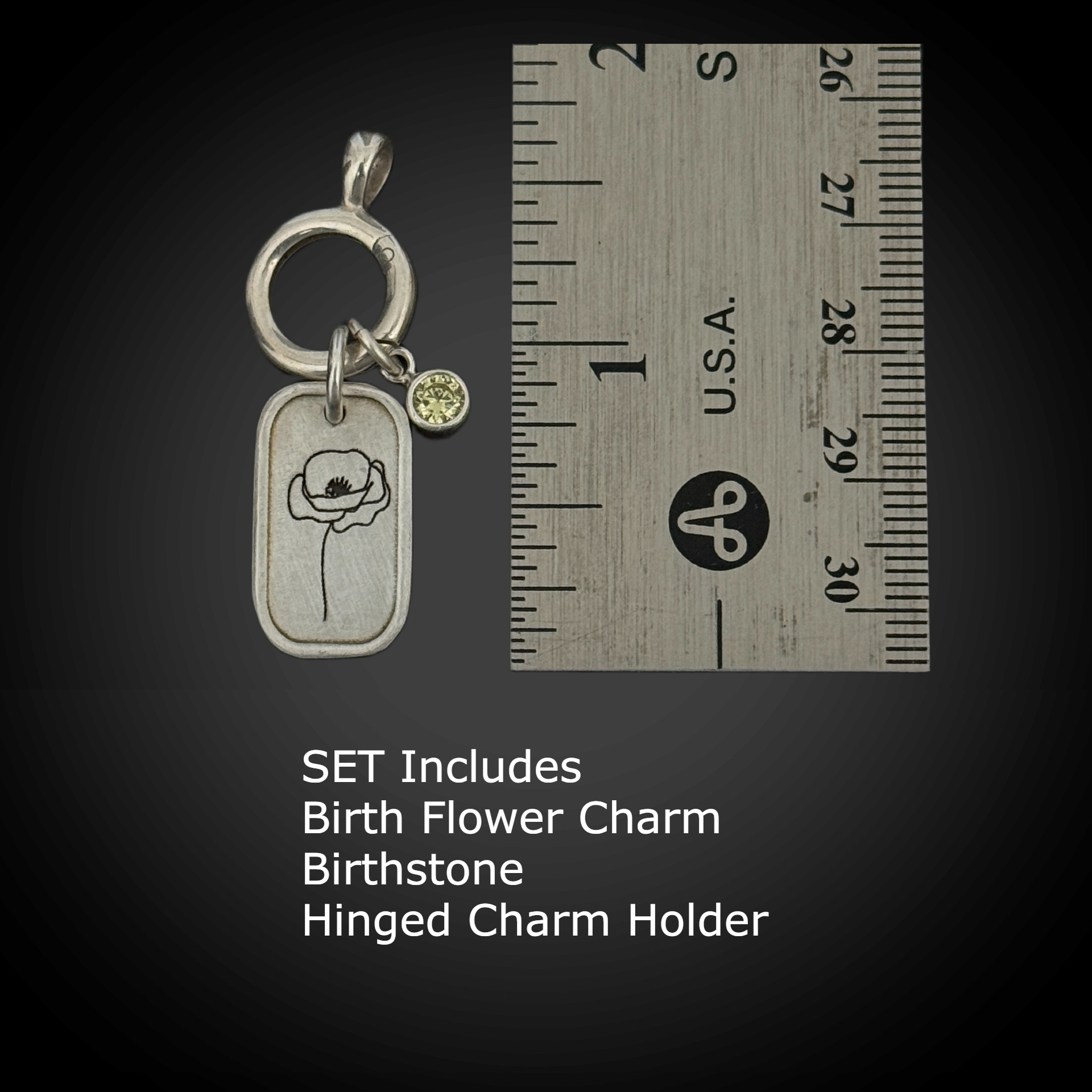 Personalized August Birth Month Poppy Flower Charm: Peridot CZ Birthstone, Hinged Charm Holder easily add charms, Sterling Silver Pendant