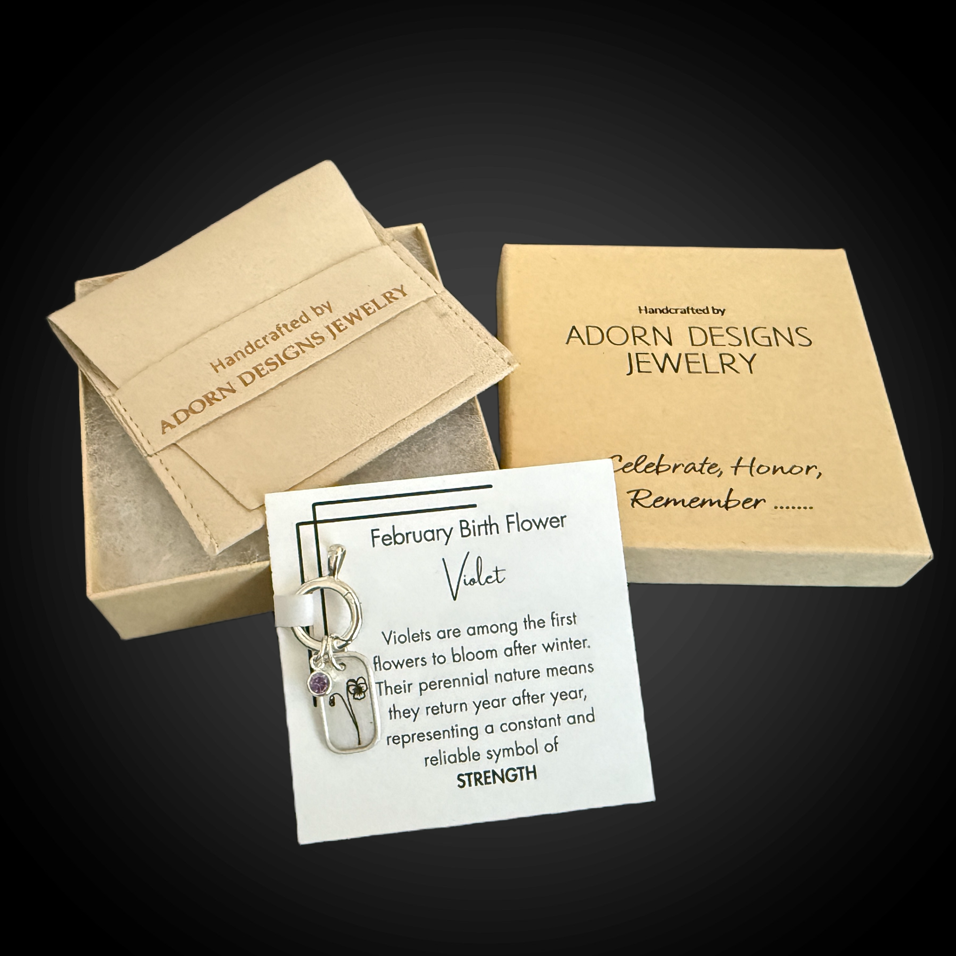 - An elegant, single line illustration of your violet birth month flower engraved on a sterling silver charm, measuring approximately 3/4" x 1/2". (Overall size is 1 1/2" x 1/2")