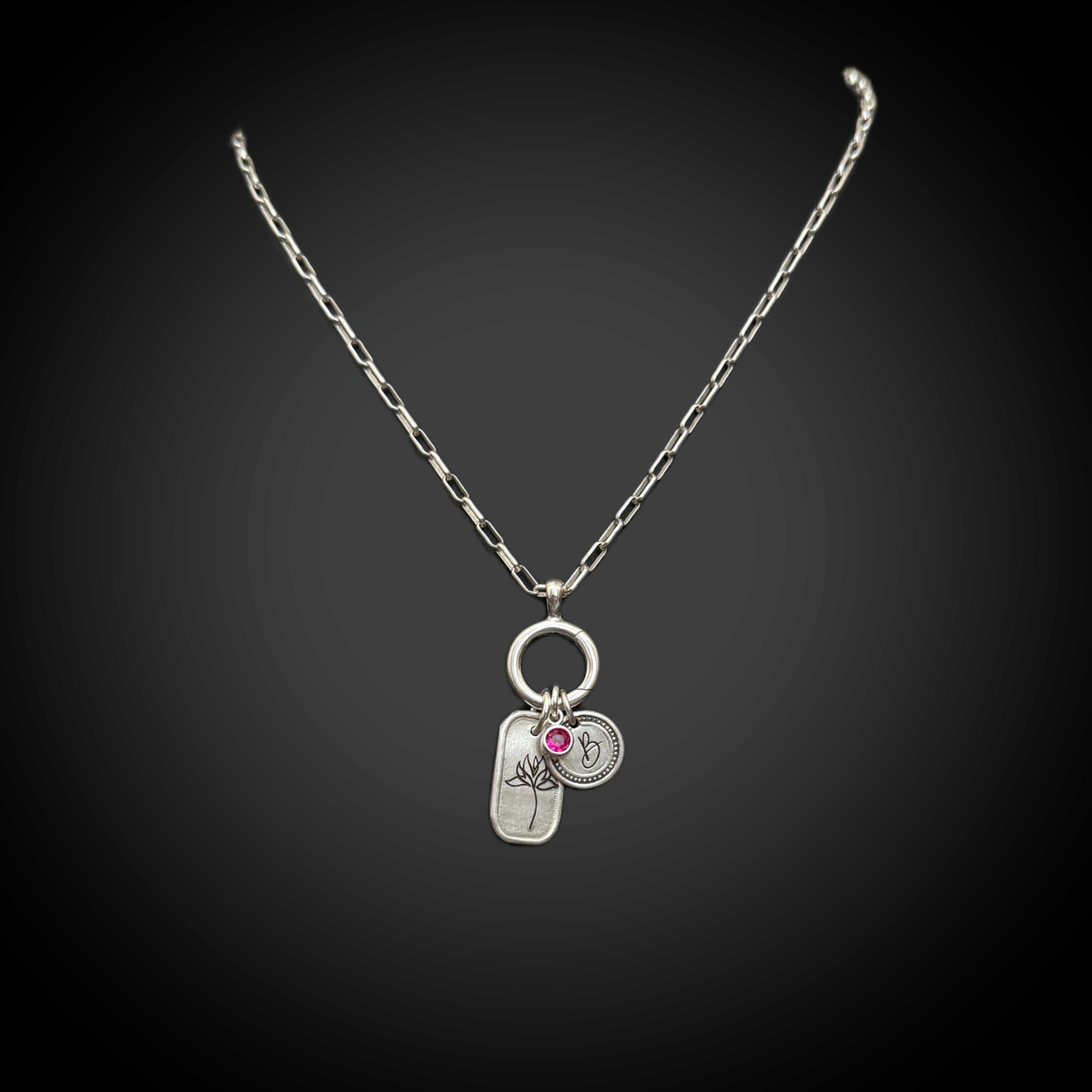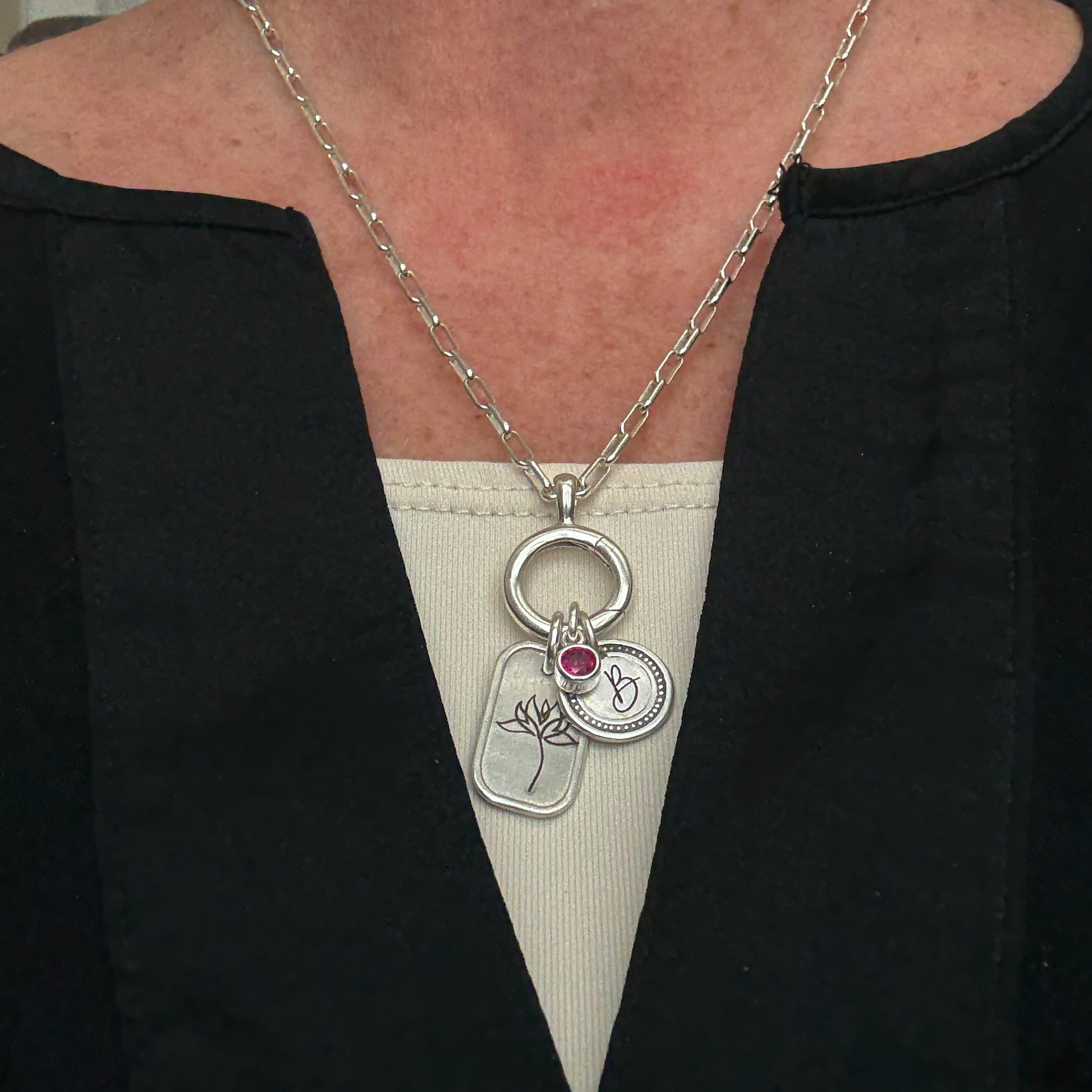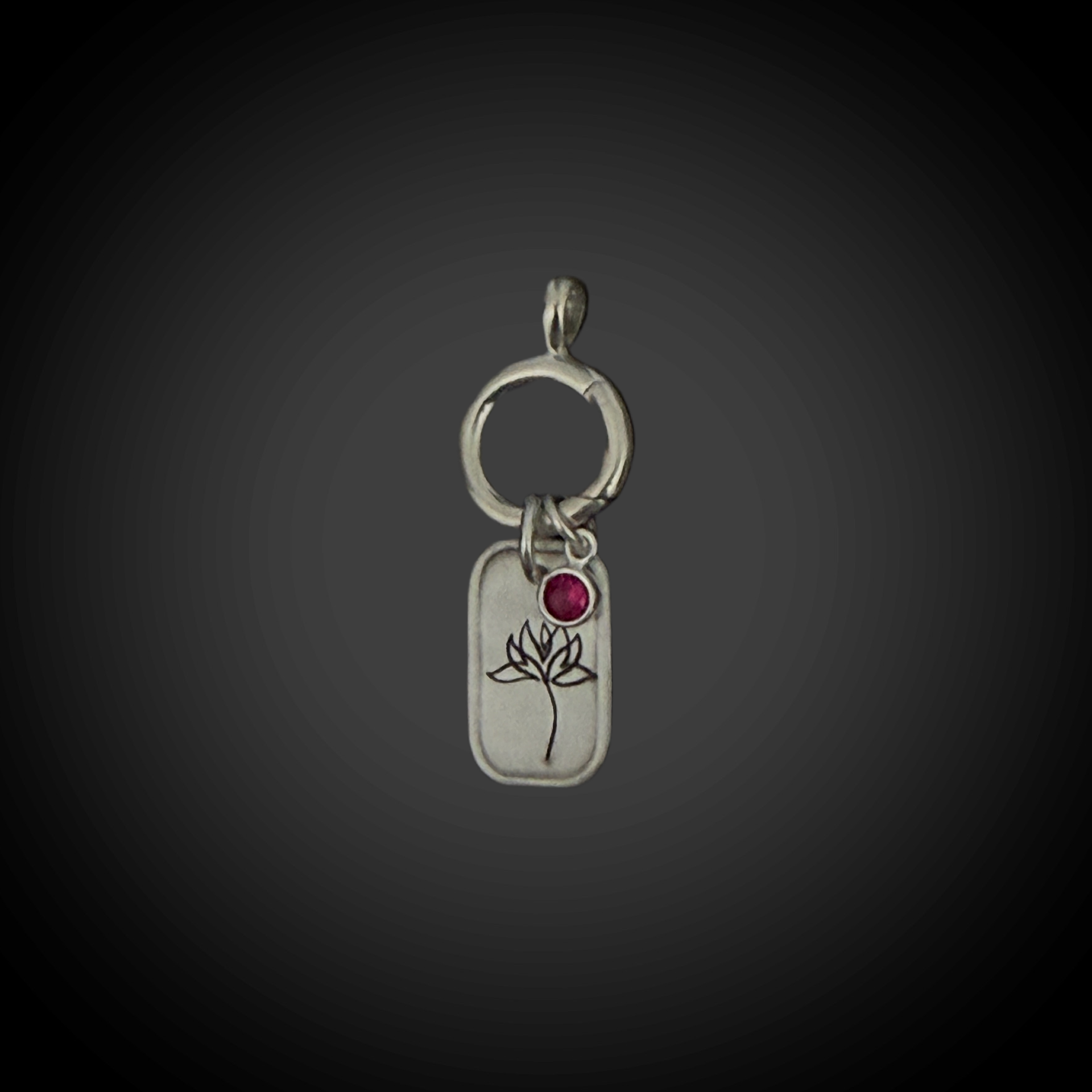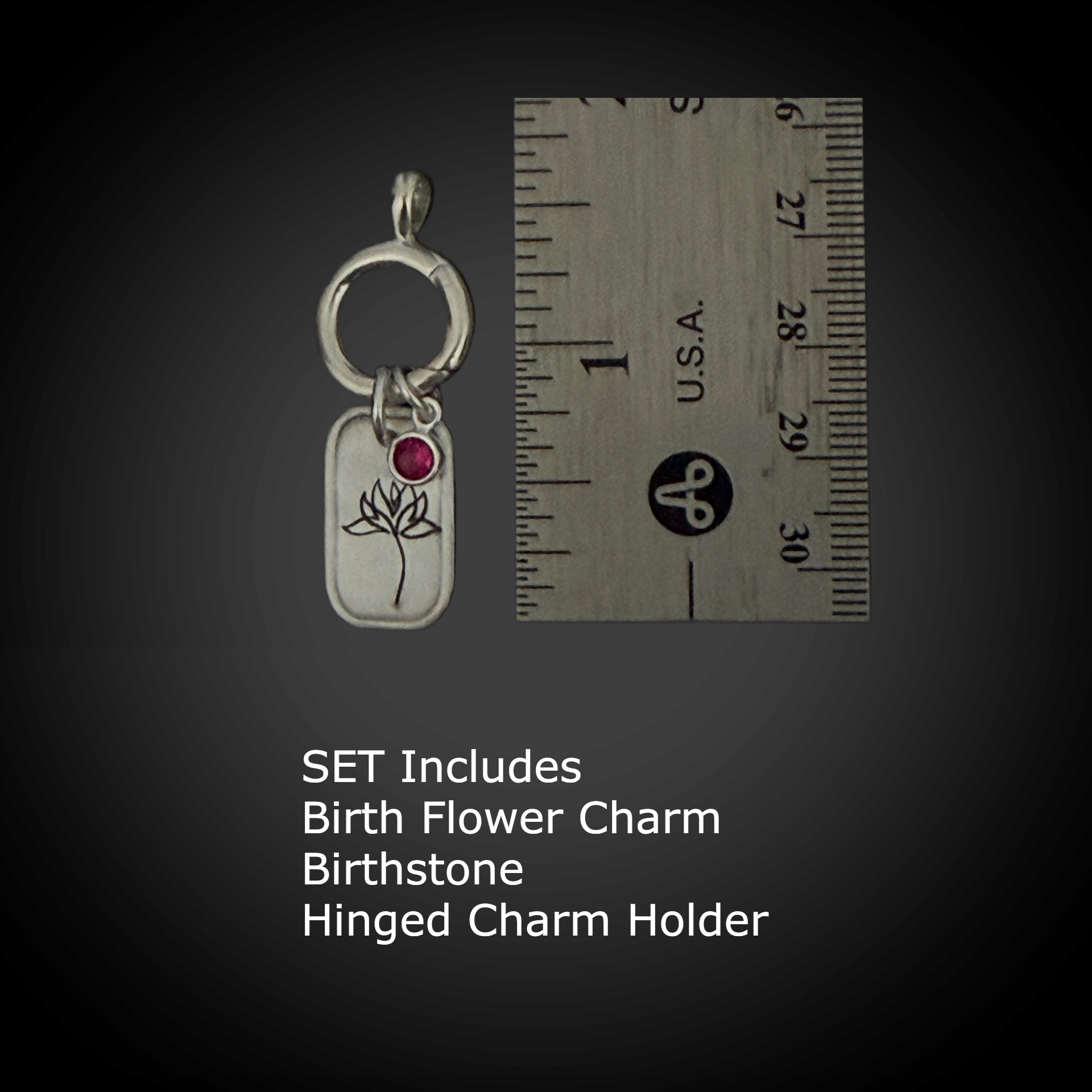 Personalized July Birth Month Water Lily Flower Charm: Ruby CZ Birthstone, Hinged Charm Holder to easily add charms, Sterling Silver Pendant