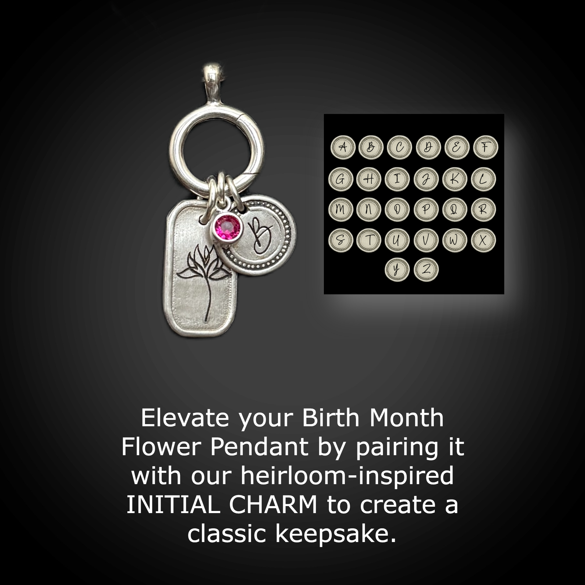 - An elegant, single line illustration of your birth month flower engraved on a sterling silver charm, measuring approximately 3/4" x 1/2". (Overall size is 1 1/2" x 1/2")