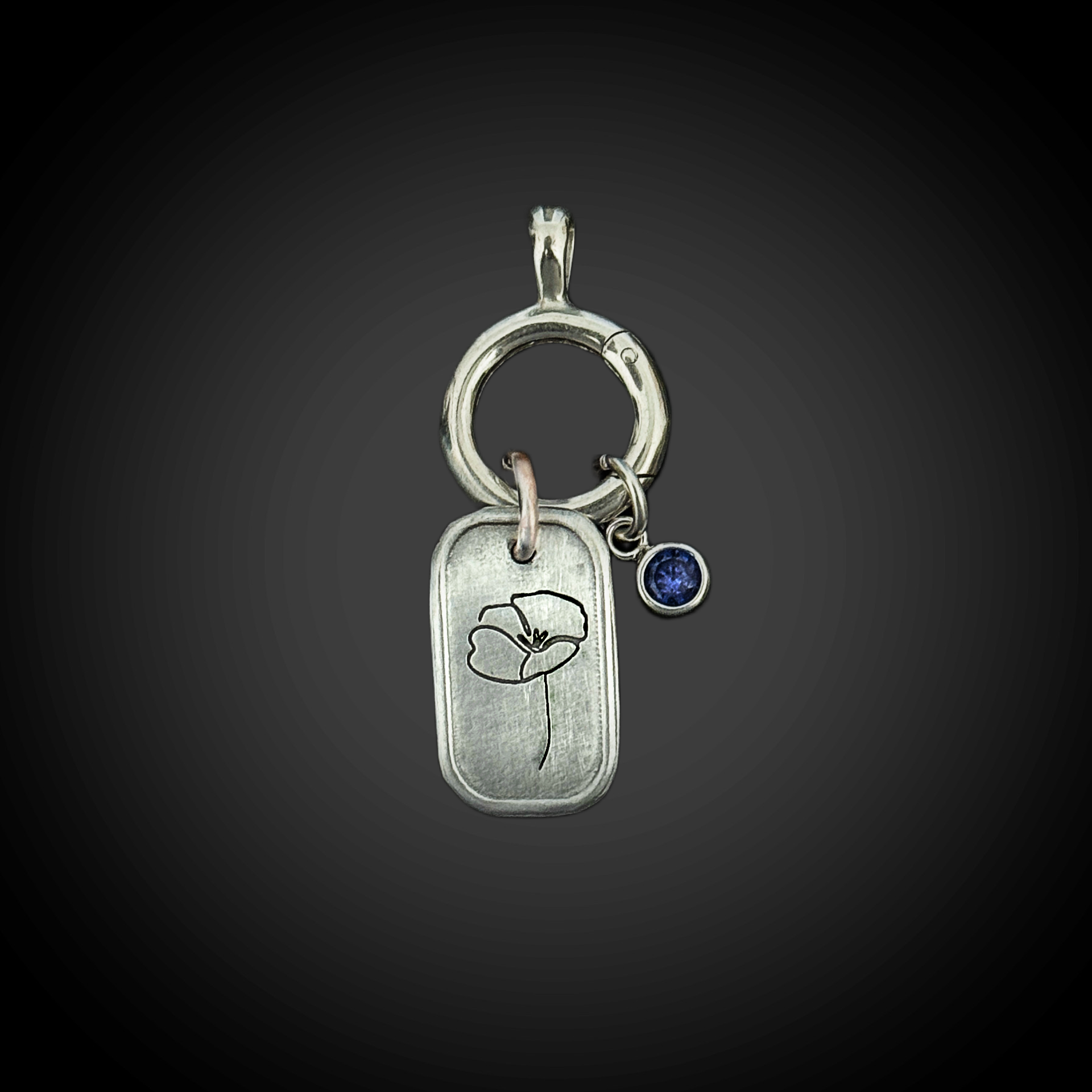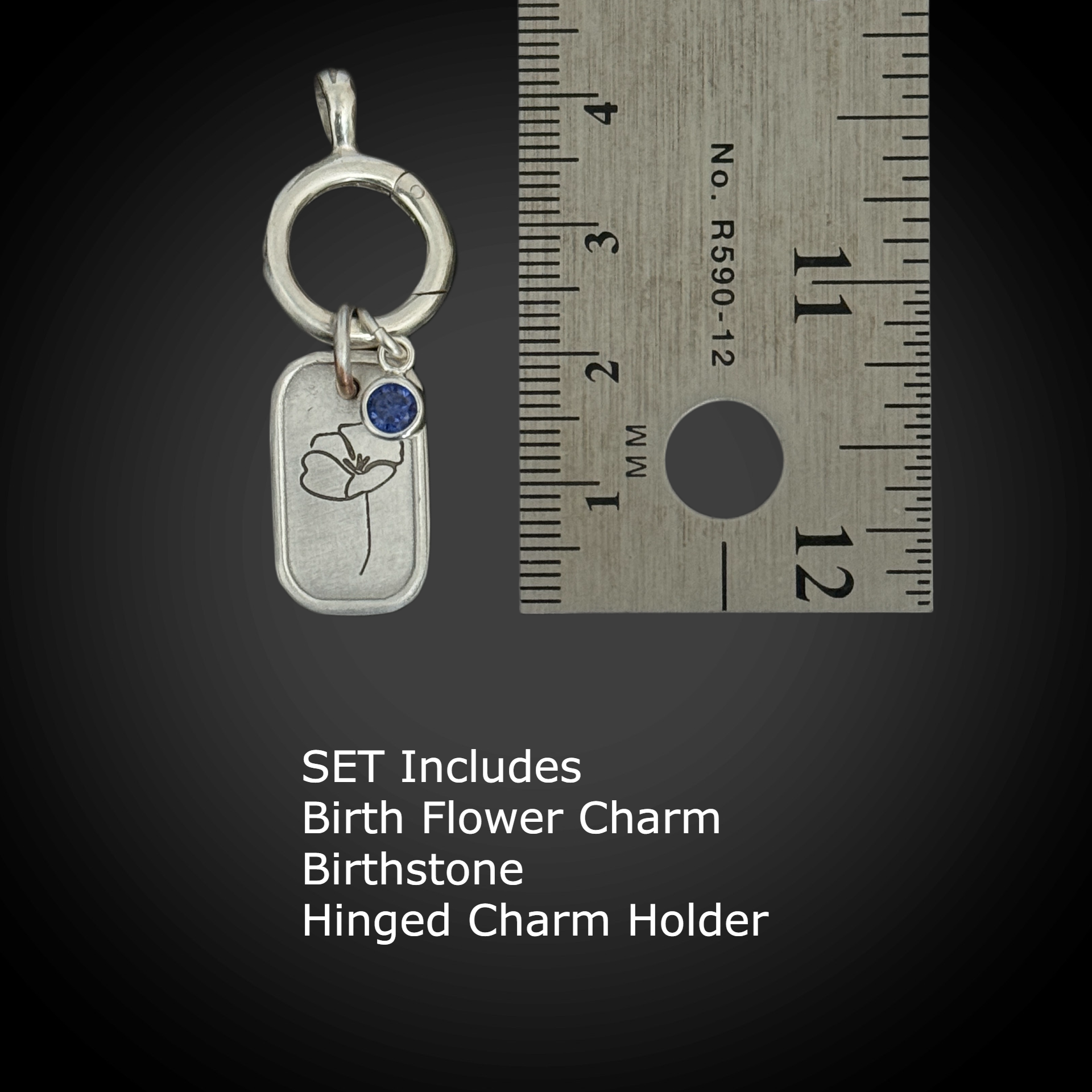 Personalized September Birth Month Morning Glory Flower Charm: Sapphire CZ Birthstone, Hinged Charm Holder can add charms, Sterling Silver