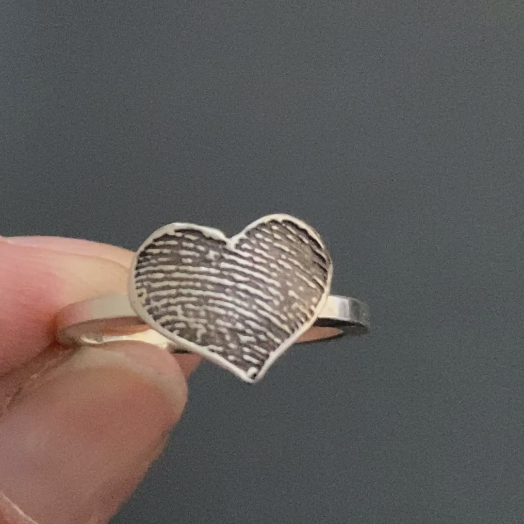 Customized and personalized, this memorial jewelry serves as a special tribute to a deceased loved one, or as a meaningful Mother's ring. The thick sterling silver square band measures approximately 1.5 mm thick and 1.5 mm wide, with a fingerprint heart that stands at approximately 3/8" tall.